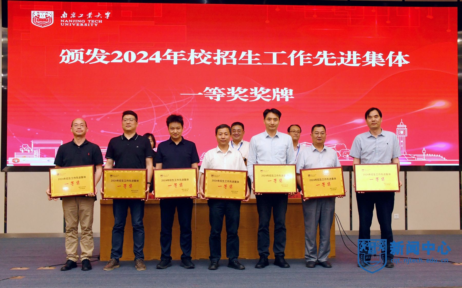 刘大卫宣读《关于表彰太阳成集团tyc33455cc2024年招生工作先进集体的决定》,夏侃宣读《关于聘任仲兆祥等23位同志担任太阳成集团tyc33455cc2025“招生宣传大使”的决定》。陆伟东、刘大卫、夏侃共同为获奖公司颁发先进集体一等奖奖牌及“招生宣传大使”聘书。化学与分子工程公司教授韩国志、食品与轻工公司员工办公室主任马慧子作为“招生宣传大使”代表分别作交流发言。