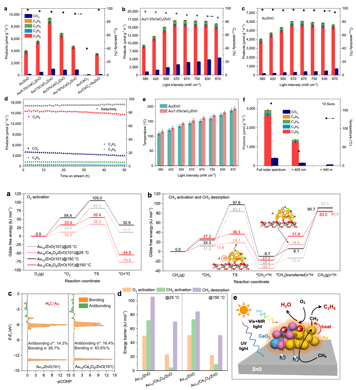 针对这一挑战,团队提出了一种整合光化学与光热效应的甲烷氧化偶联新策略。使用Au和CeO2纳米颗粒修饰的ZnO光催化剂,在宽光谱光照下实现甲烷高效转化为乙烷、乙烯等C2+烃类。其中,紫外光激发ZnO以活化碳氢键,Au纳米颗粒LSPR效应将可见-近红外光转化为热能,协同CeO2强化了基元反应动力学过程,显著增强了C2+烃类生产,实现了创纪录的产率17.26 mmol g−1h−1和高达90%的选择性,且在50小时连续反应中保持94%以上的稳定性,性能远超现有光催化体系。该工作为甲烷高效转化与太阳能利用提供了新思路。团队的研究得到了国家自然科学基金等项目的支持。
